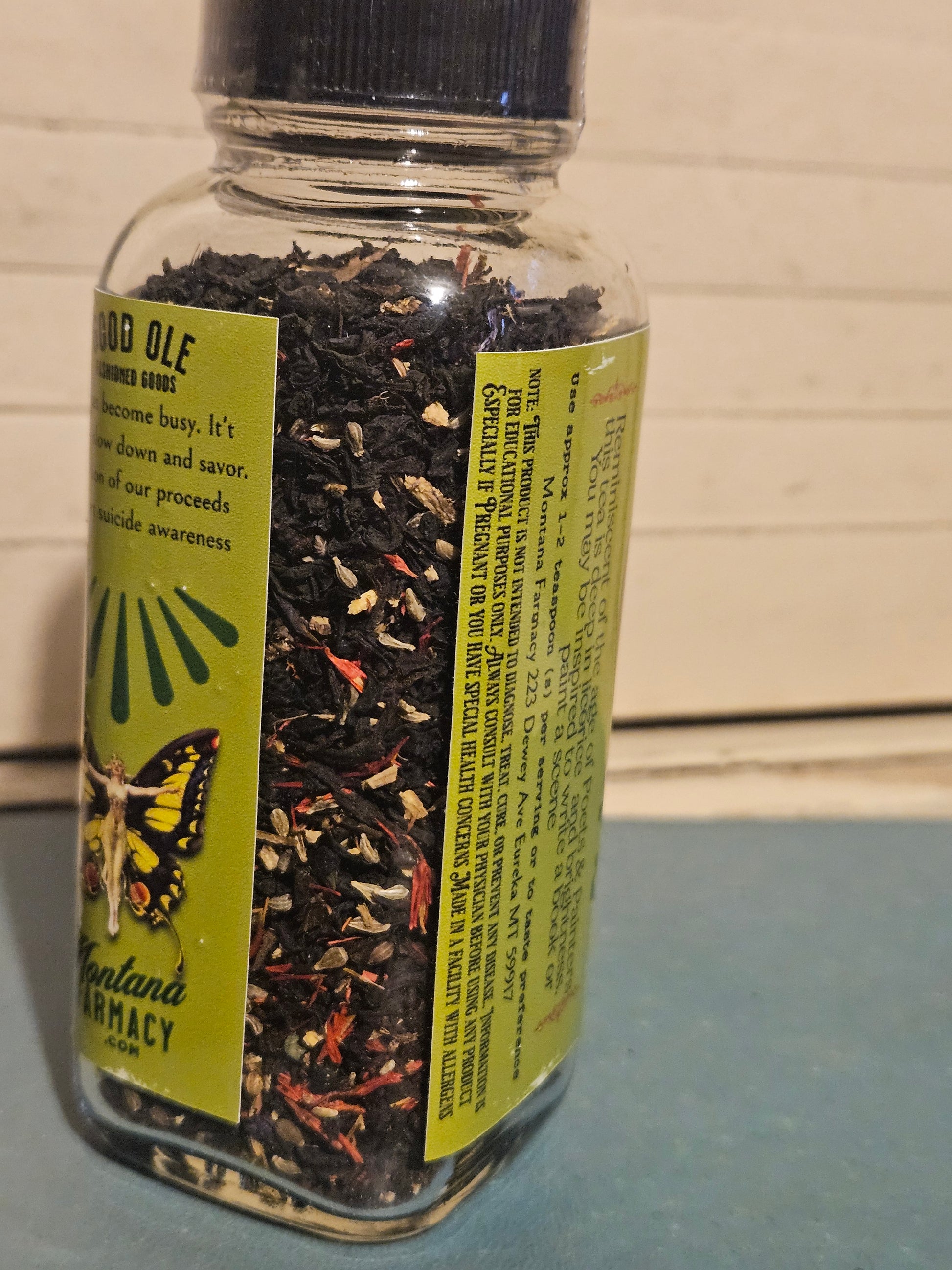 Vegan. Caffeinated. Blended small batch in Montana. Tea in 6 oz glass bottle.