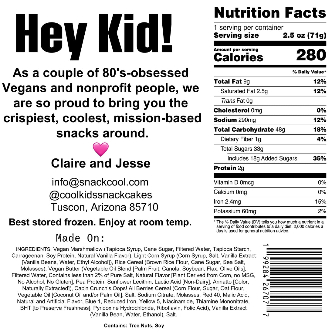 Ingredients: Rice cereal, sugar, vegan marshmallow, corn syrup, vegan butter, vanilla extract, salt, vegan fruit cereal. See photos for expanded ingredient list. Contains tree nuts and soy.