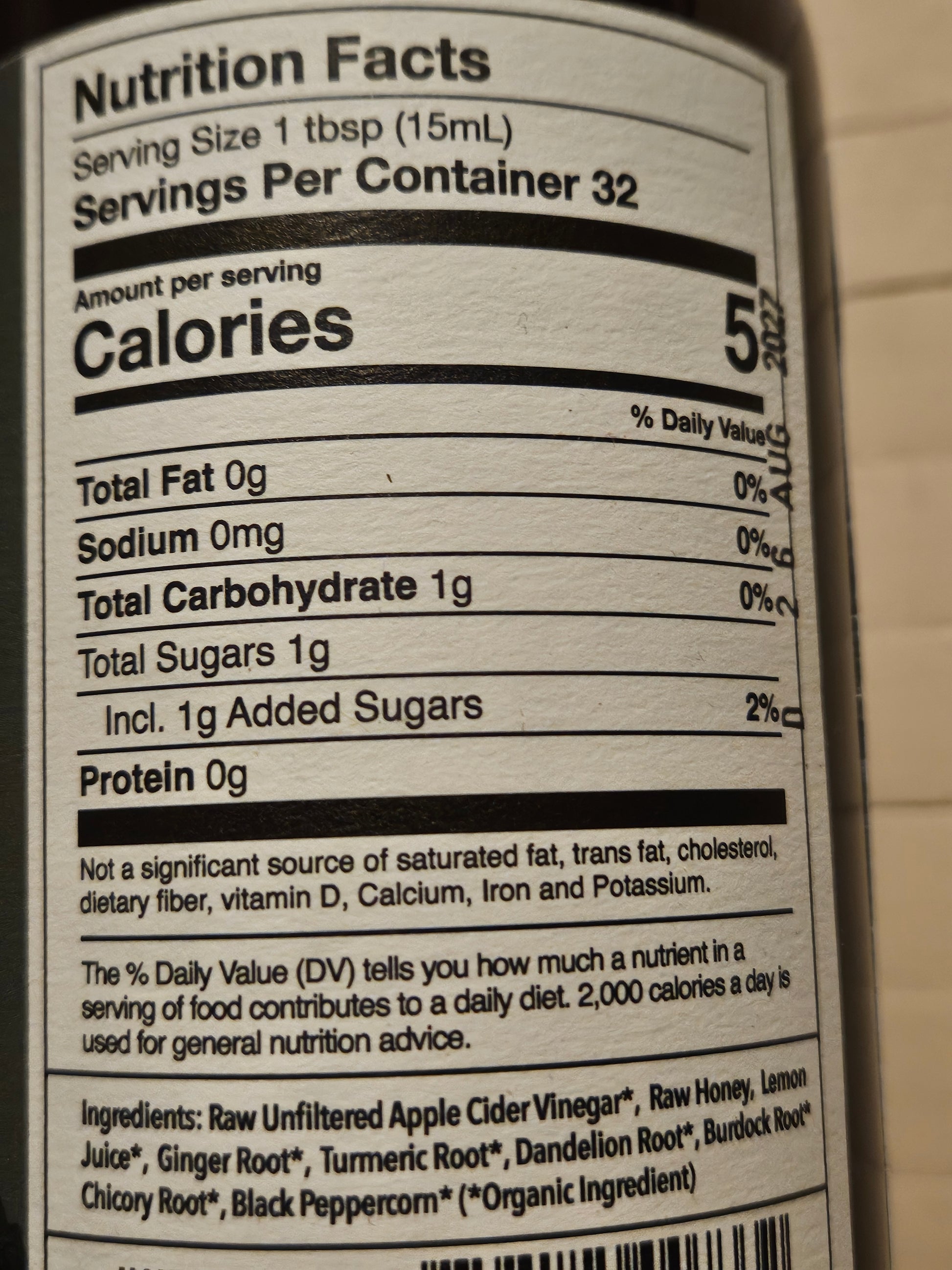 Ingredients: Raw unfiltered apple cider vinegar, Raw Honey* , Lemon Juice, Ginger Root, Tumeric Root, Dandelion Root, Burdock Root, Chicory Root, Black Peppercorn. **All ingredients but honey are certified organic.