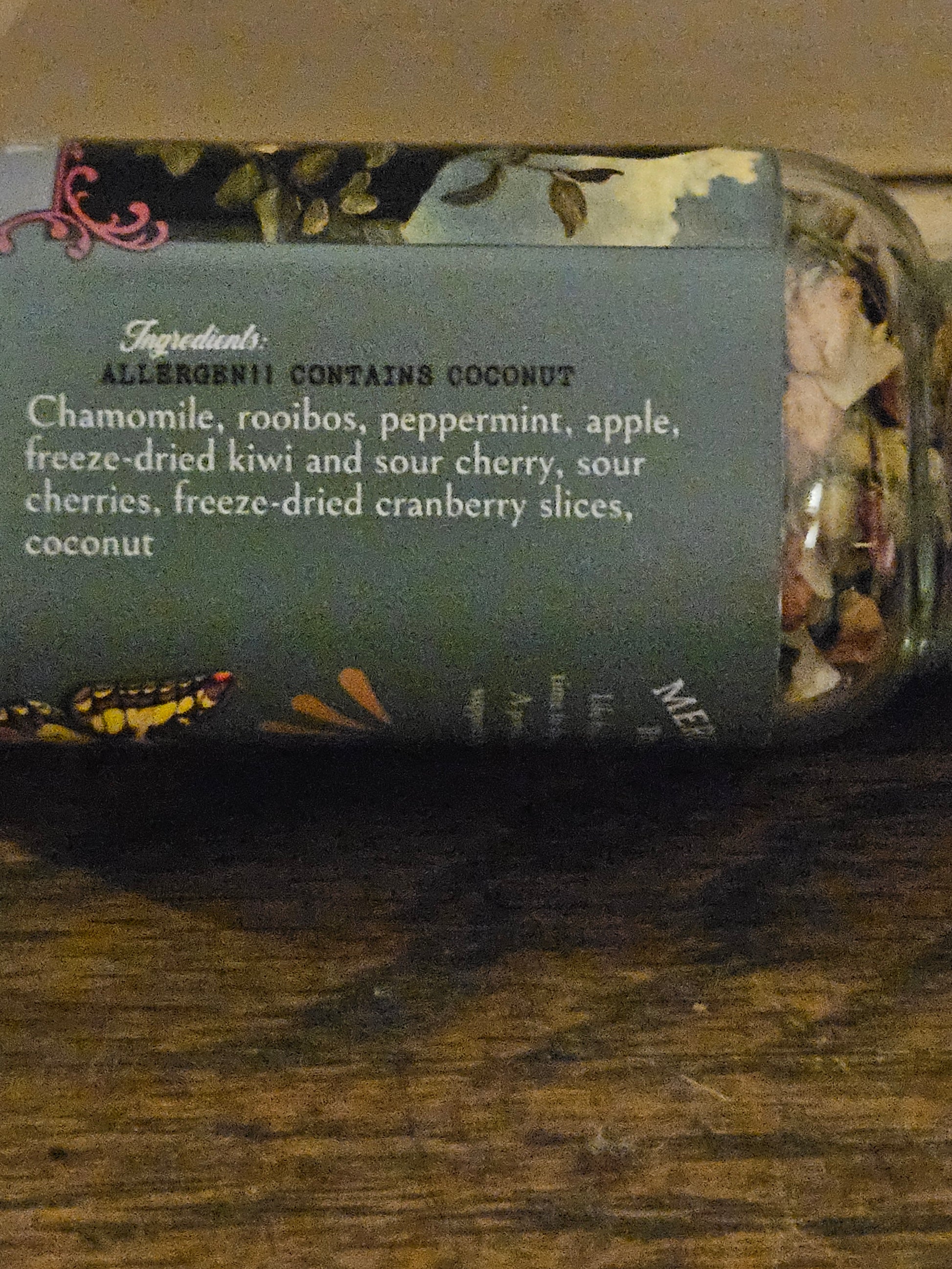 Ingredients: Chamomile, Rooibos, peppermint, apple, freeze dried kiwi, sour cherries, cranberry slices, coconut.