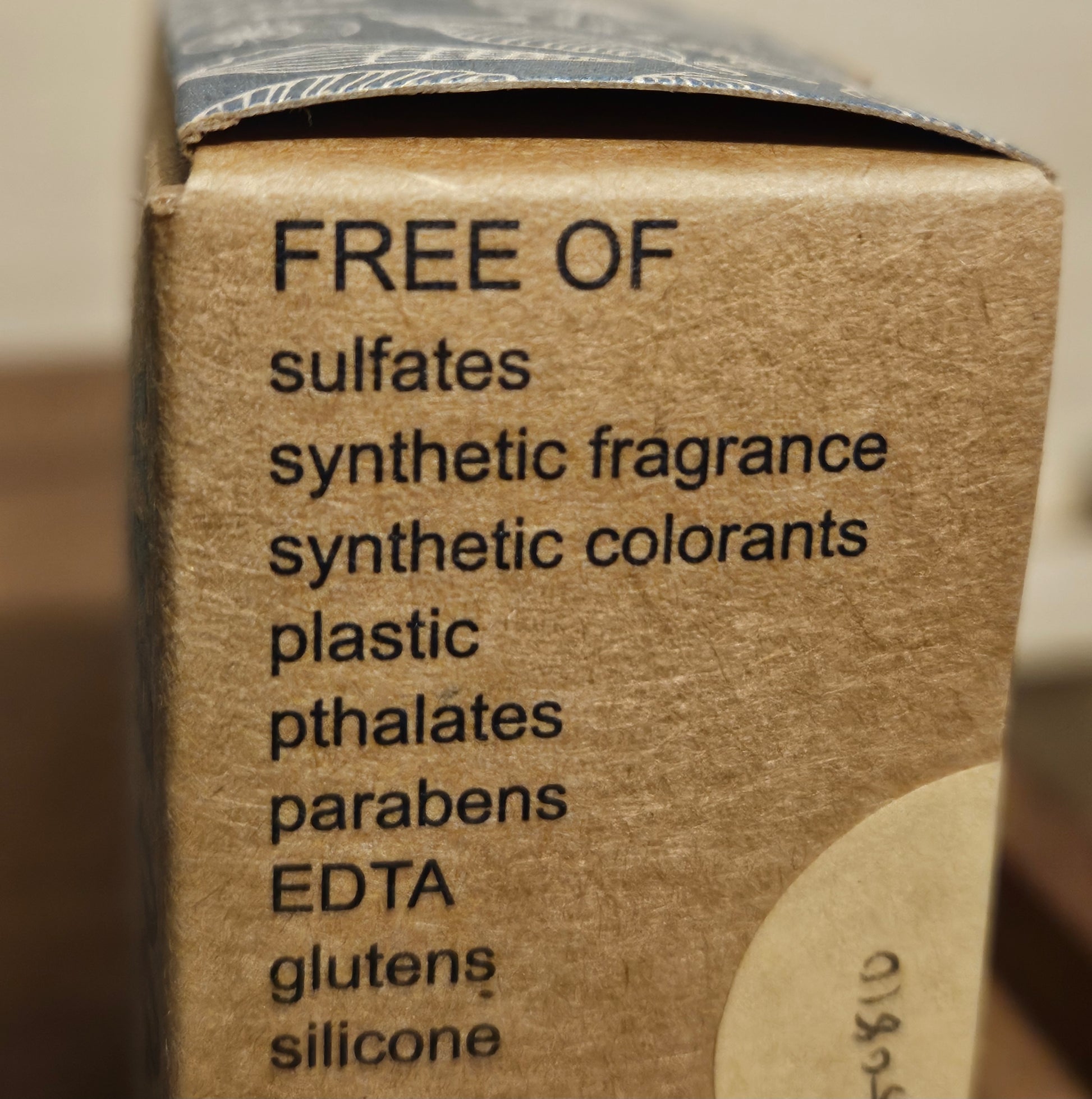 Ingredients: sodium cocoyl isethionate (from coconut oil), cetyl alcohol,> coco glucoside (from coconut oil & glucose), babassu seed oil,* stearic acid,> behentrimonium methosulfate (and) cetyl alchohol (and) butylene glycol (from rapeseed oil, RSPO certified palm oil, and corn), glycerin,+ guar gum, {benzyl alcohol (and) salicylic acid (and) glycerin+ (and) sorbic acid},^ eucalyptus essential oil,* bergamot essential oil,* lemon essential oil,* ylang ylang essential oil,* spirulina,* indigo powder, citric acid (non-GMO)