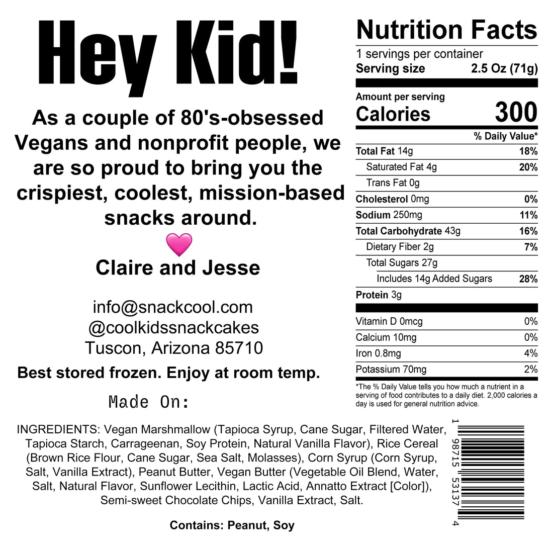 Ingredients: Rice cereal, sugar, vegan marshmallow, corn syrup, vegan butter, peanut butter, semi-sweet chocolate chips, vanilla extract, salt. *See photo for expanded ingredient list. Contains peanuts and soy.