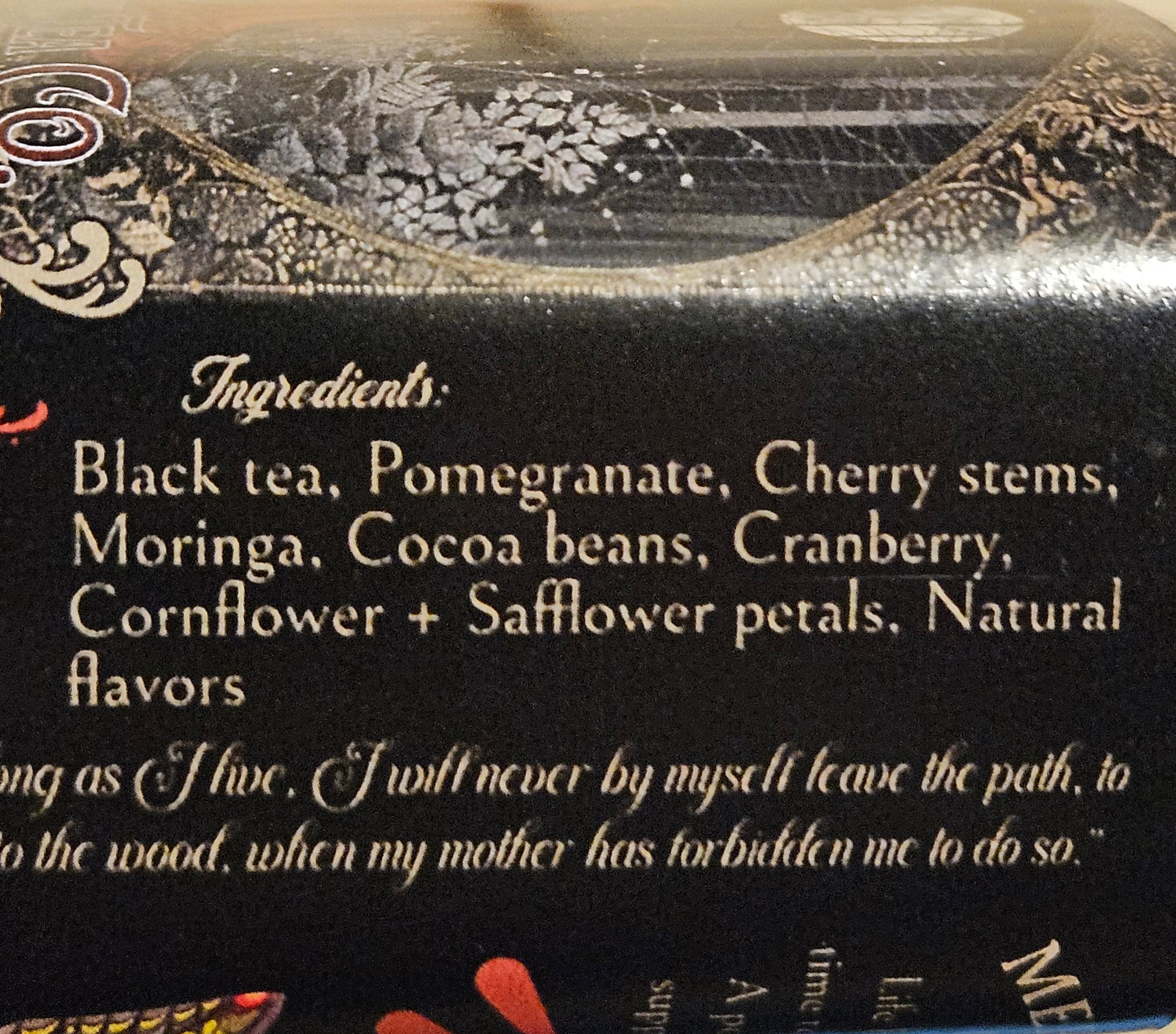 Ingredients: black tea, pomegranate, cherry stems, moringa, cacao beans, cranberry, cornflower petals, safflower petals, natural plant flavors.
