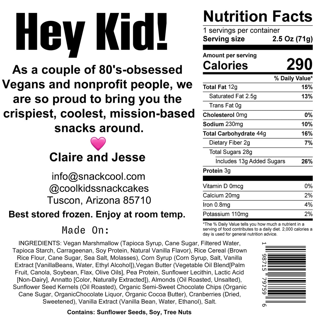Ingredients: Rice cereal, sugar, vegan marshmallow, corn syrup, vegan butter, almonds, sunflower seed kernels, organic semi-sweet chocolate chips, dried cranberries, vanilla extract, salt. See photos for expanded ingredient list. Contains tree nuts and soy.